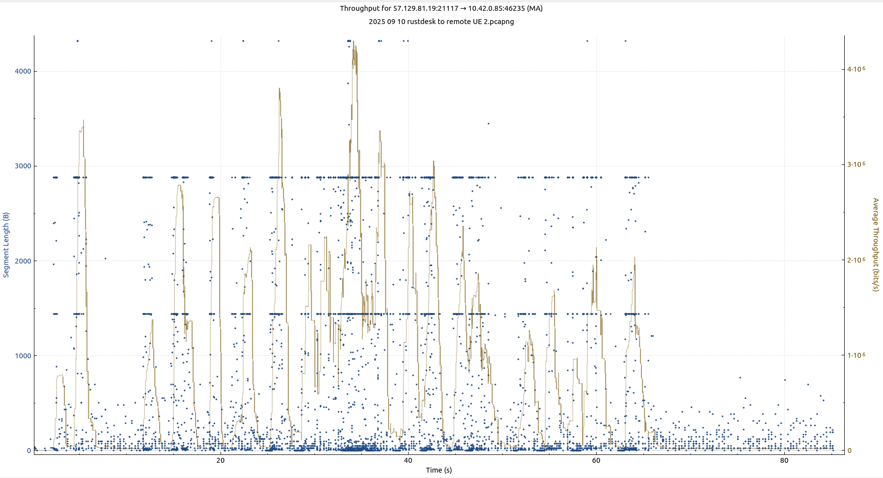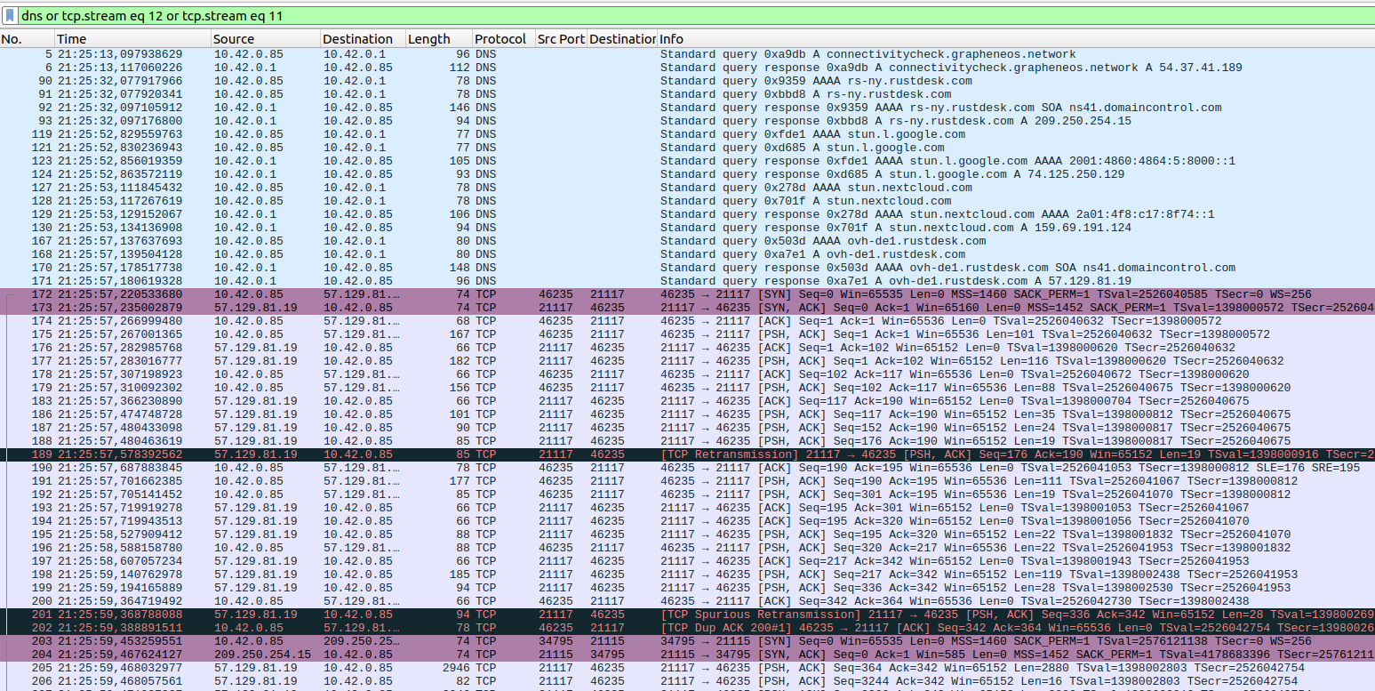 While I expected to see WebRTC on UDP being used, which is a typical transport-, video- and security protocol and used by many messenger services, Rustdesk uses a TCP connection. On the RustDesk web page, it is stated that encryption is based on the NaCl library. While I’m not a crypt analyst I still had a look at the data stream, and apart from the beginning of the stream, I could only see random looking data being exchanged. How much or little that means is difficult to say from the trace, but those who want to dig deeper can always look at the code to find out more.