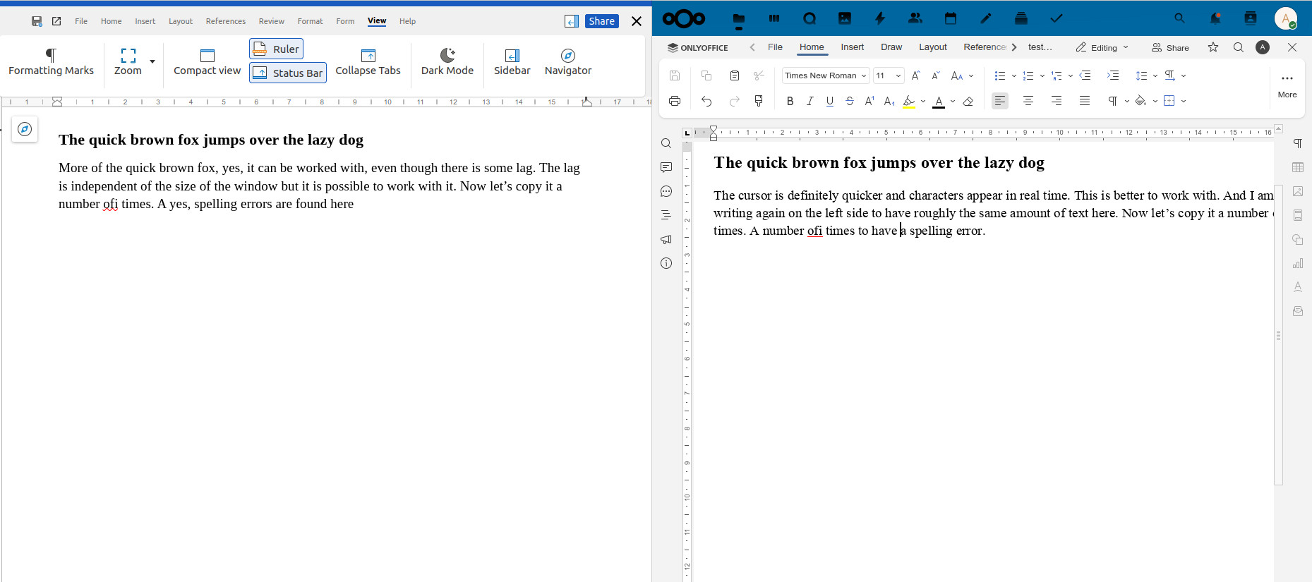 Two years ago, I switched from editing documents I store on my Nextcloud with Collabora (Libreoffice) Online to OnlyOffice Online. The main reason: The self-hosted Collabora/Libreoffice Online server renders changes made in documents on the server side and then downloads the result into the browser. The unfortunate consequence: There was a noticeable delay between typing something and characters appearing on the screen if one is not close to the server.