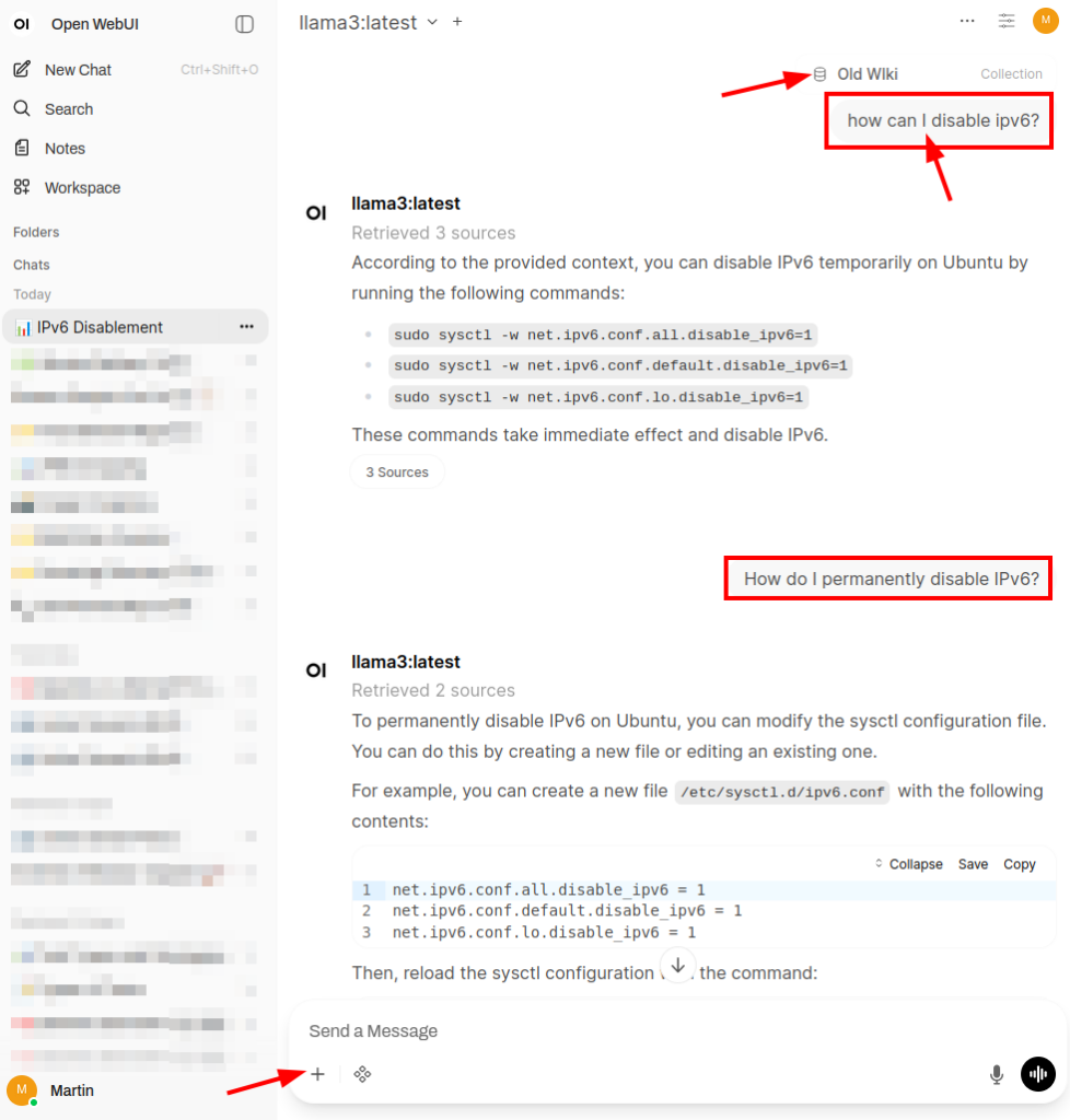 Once the documents are imported one can search in them with an LLM prompt by clicking on the plus sign and selecting the new knowledge base with ‘Attach Knowledge’. The screenshot at the beginning of the post shows how a search looks like in practice with the following example: Every now and then, I need to disable IPv6 on a network interface. One can do that in the desktop settings, but I often prefer commands in the shell. And so a long time ago, I noted down those commands in my Wiki for quick access. OpenWeb UI and the local llama3 LLM provide a good result and one can ask follow up questions which are also answered correctly. References to the original html pages are provided as well, so one can get to the original page quickly. Overall a nice system that often beats my previous search for keywords in filenames approach.