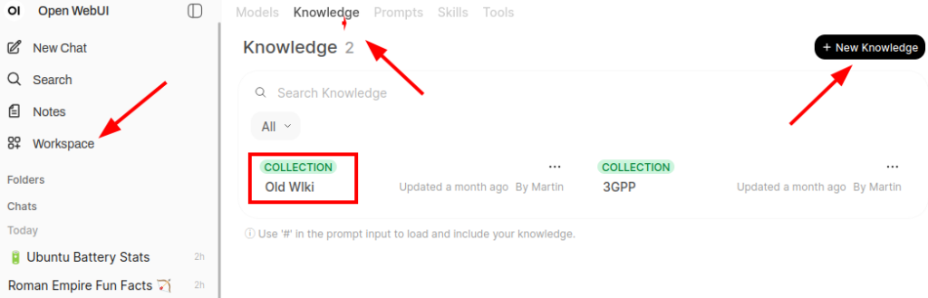 As shown in the screenshot above, Open WebUI can import local documents for RAG search via the ‘Workspace‘ icon on the left side and then by clicking on ‘Knowledge‘ in the top ribbon. After creating a new knowledge base, new local documents can be uploaded in batches. In my case, I had around 1500 html documents I uploaded in one go. Importing them took a while, perhaps 15 to 30 minutes during which the CPU rather than the GPU was quite busy.